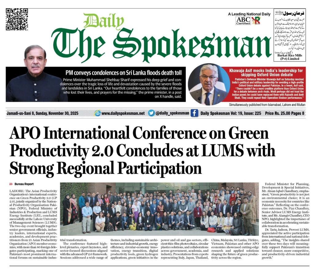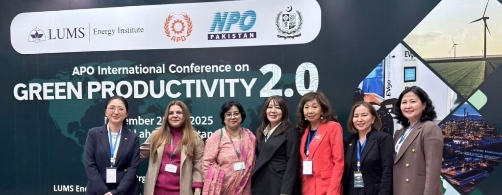 The Institute of Business Management (IoBM), ORIC–Team personnel led by Dr. Seema Ansari Director ORIC were honored to represent Pakistan at the Asian Productivity Organization’s International Conference on Green Productivity 2.0 (GP 2.0), held at LUMS Lahore. The two-day event brought together senior government officials, industry leaders, international experts, academics, and development practitioners from 21 APO member countries, with over 80 foreign delegates participating, making it one of Pakistan’s most prominent international forums on sustainable industrial transformation.